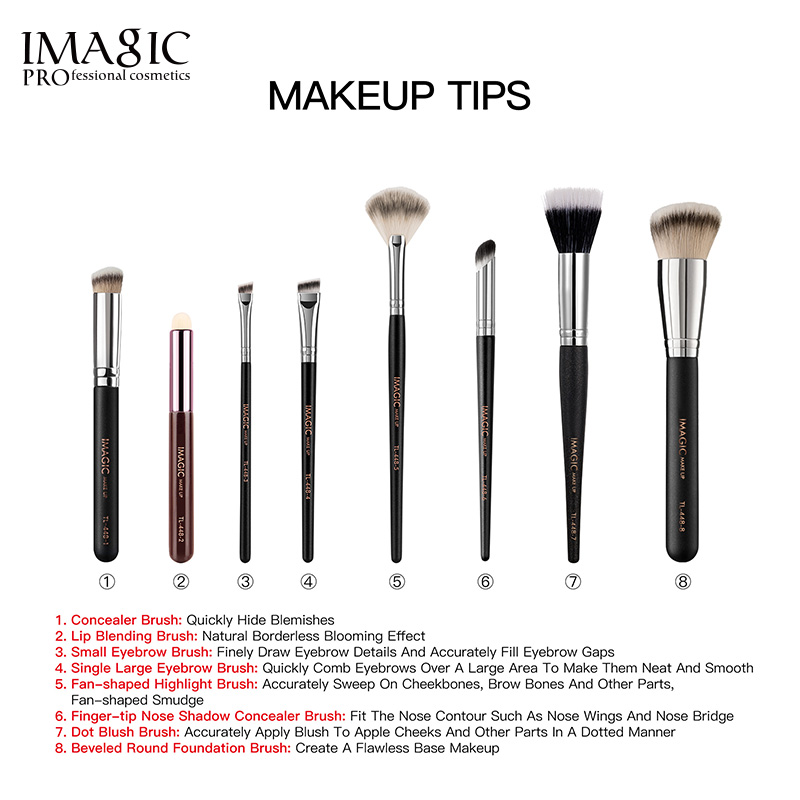 - 8pcs different brushes available–1# concealer brush; 2#lip brush; 3# small eyebrow brush; 4#big eyebrow brush; 5#fan brush; 6#Finger belly concealer / nose shadow brush; 7# blush brush; 8# foundation brush